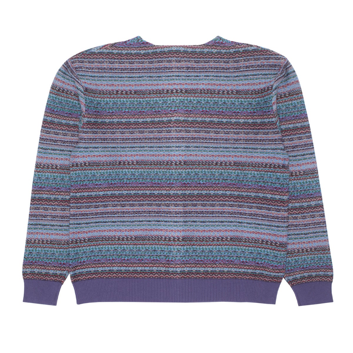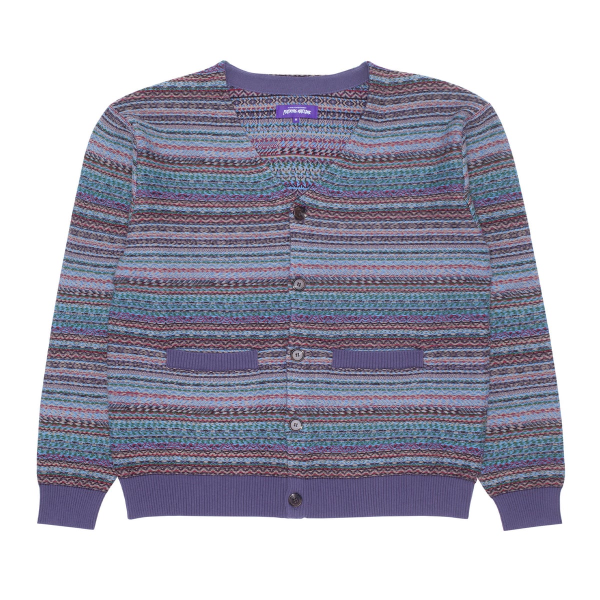 Reverse Sided Knitted Intarsia Cardigan. 100% Cotton Yarn Showcasing the Reverse Side of Fair Isle Pattern. Yarn Floats Create Pattern Resembling Abstract Dill Painting. 2x1 Ribbing at Cuffs and Bottom Hem With Hidden Front Placket. Custom Branded 4-Hole Buttons at Center Front.