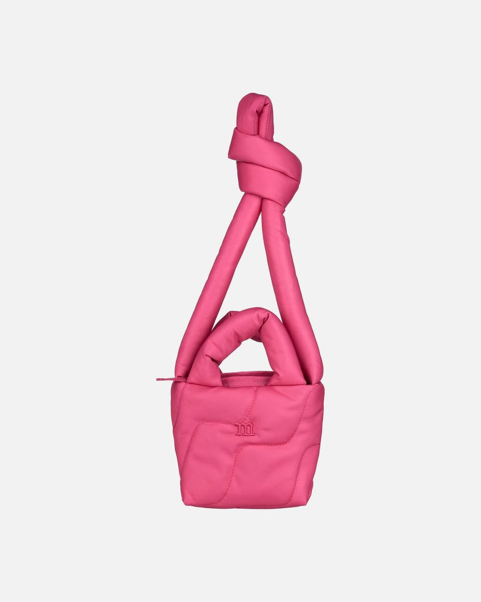 Topattu Pillow Mini -olkalaukku on valmistettu kierrätetystä polyesterista ja siihen on tikattu Taifuuni-kuosi. Laukussa on topattu kantokahva sekä topattu olkahihna, jonka voi solmia oikeaan pituuteen. Laukussa on vetoketjusuljenta sekä yksi vetoketjutasku sisäpuolella. Marimekon M-kirjain on brodeerattu etupuolelle.
