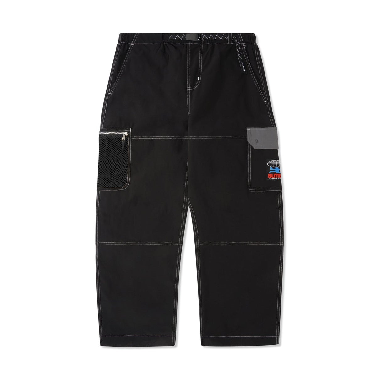 - Cotton nylon blend loose fit cargo pants - Contrast stitching throughout - Adjustable pull cord on leg opening - Elasticated waist - Custom jacquard belt