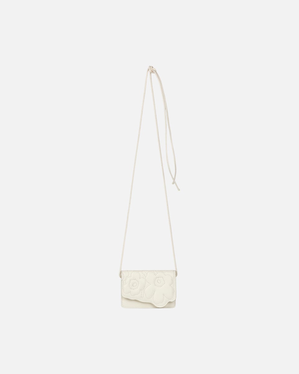 Nahasta valmistetussa vyölaukussa on pehmustettu kansi, johon on tikattu Unikko-kuosi. Kansi sulkeutuu painonapilla ja laukussa on puuvillahihna. Korteille tarkoitettua pientä vyölaukkua voi kantaa monella eri tavalla: vyötäröllä, kaulan ympärillä tai olan yli.