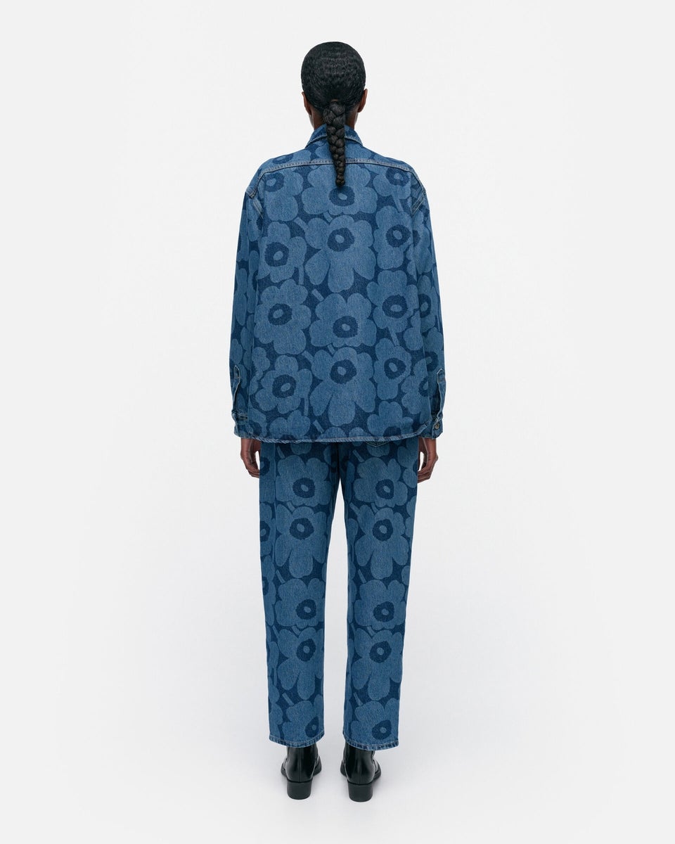 Sininen, Unikko-kuosinen Maridenim Vaihe -farkkupaita on valmistettu joustamattomasta puuvillakankaasta. Kauluspaidassa on farkkunappisuljenta, rintatasku ja takana kaarrokesauma. Hihansuissa on mansetit ja farkkunappisuljenta ja helmassa on loivasti pyöristetty leikkaus.