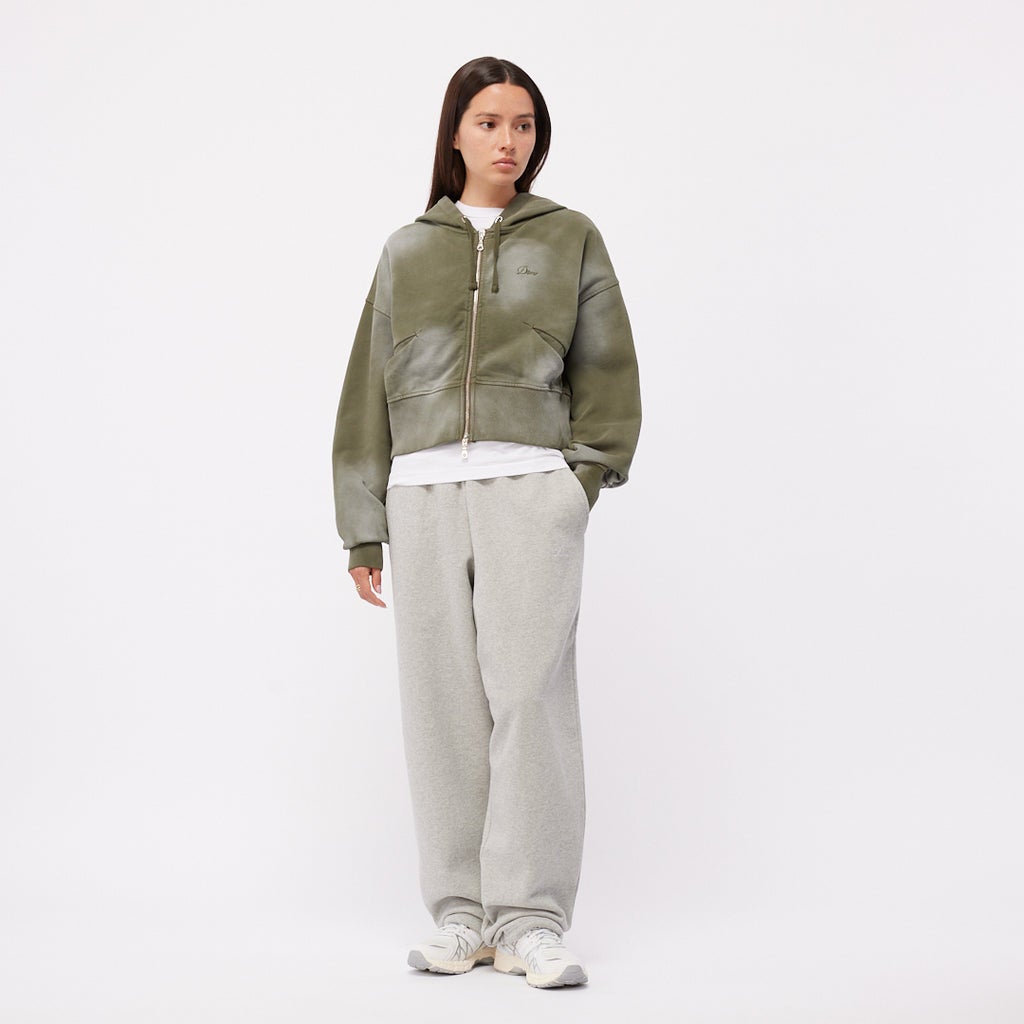 100% Cotton French Terry Garment-dyed & Spray washed YKK 2-way metal zipper Dart waist pockets Jersey lined hood Cursive logo embroidery