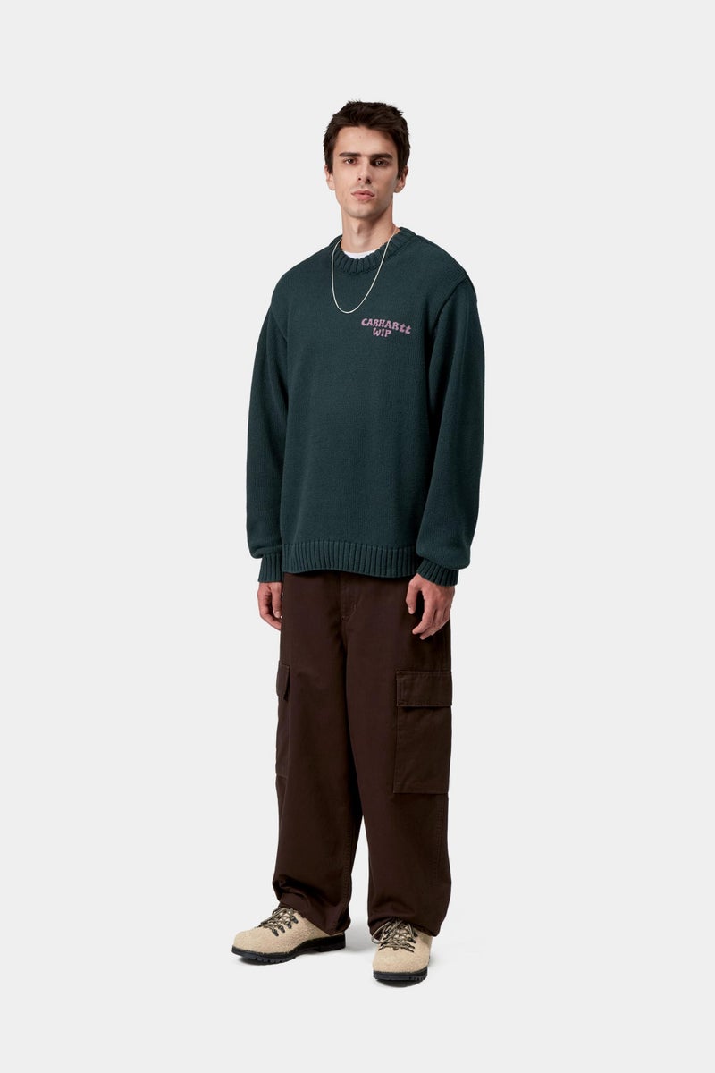 The Helix Sweater is a midweight style knit from recycled cotton yarn and polyester. The item features a rib-knit collar and cuffs. Graphic prints appear on the front and back.