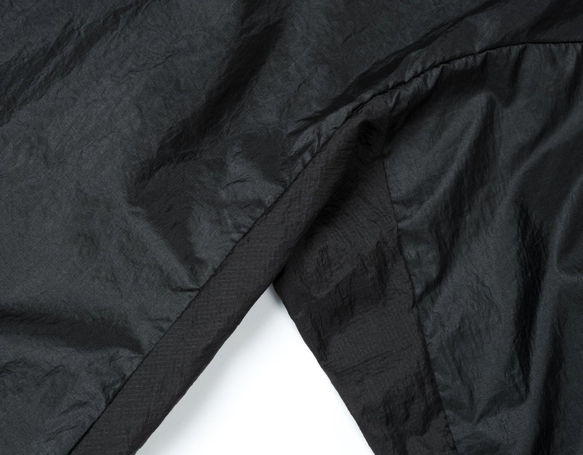 Produced with Pertex® Diamond Fuse fabric from Japan. Ultra-lightweight, wind resistant, water repellent, abrasion resistant, breathable, fast dry. Ergonomic cut with articulated sleeves. Underarm panels in Rippy™ ripstop for targeted ventilation. Adjustable storm hood with reflective bungee cord for fit and visibility. Adjustable hem with drawcord. Packs down into zipped pocket. Stealth-reflective ©SATISFY logo. Exterior detachable care label.