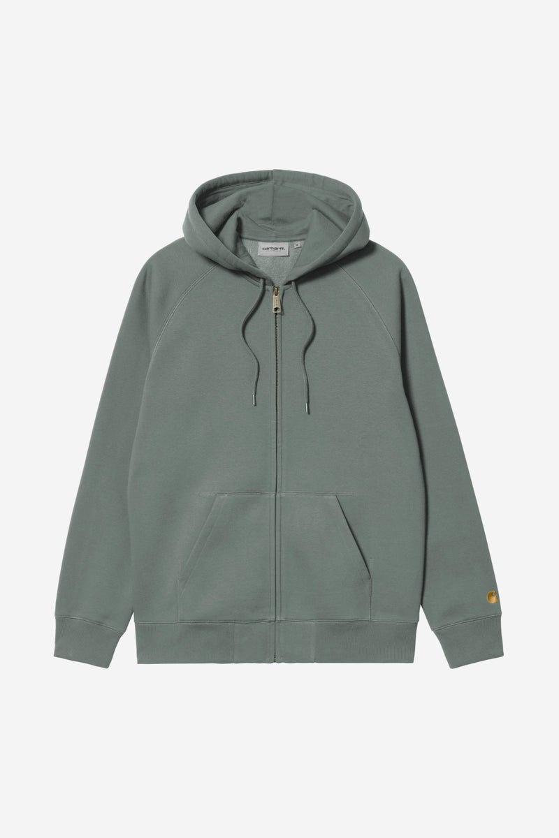 The Hooded Chase Jacket is constructed from heavyweight polycotton jersey in a regular fit. The fabric has also been brushed, giving it a fleece-like backing. The item features raglan sleeves and is detailed with flatlock stitching. An embroidered 'C' Logo appears on the left sleeve.